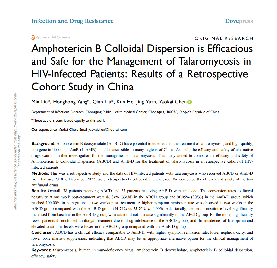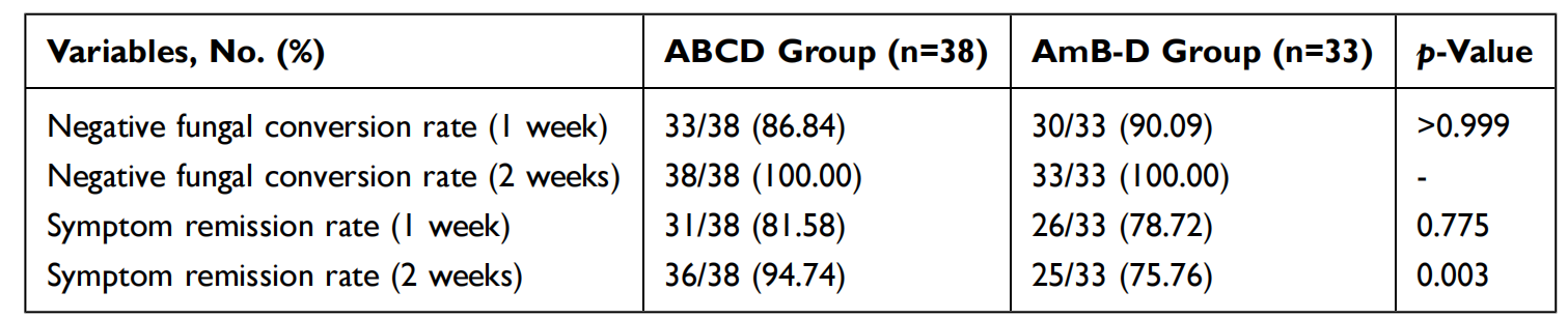 近期,《Infection and Drug Resistance》(2024,IF2.9,DOI: 10.2147/IDR.S481856)发表了一项由重庆市公共卫生医疗救治中心感染科陈耀凯教授牵头开展的,既往接受过ABCD或AmB-D治疗的HIV阳性马尔尼菲蓝状菌病回顾性研究的结果,旨在比较ABCD和AmB-D在HIV阳性马尔尼菲蓝状菌病患者的疗效和安全性。一项回顾性研究,研究对象为2018年1月至2022年12月期间接受过ABCD或AmB-D治疗的HIV阳性马尔尼菲蓝状菌病的患者。通过收集其相关病例资料,比较了两种抗真菌药物的疗效和安全性。共纳入38例接受ABCD治疗的患者、33例接受AmB-D治疗的患者。ABCD组治疗一周后的真菌阴转率为86.84%(33/38),AmB-D组为90.09%(30/33),两组在治疗后两周后真菌转阴率均达到100.00%。与AmB-D组相比,ABCD组在两周时的症状缓解率更高(94.74% vs 75.76%; P=0.003)。此外,AmB-D组血清肌酐水平较基线显著升高,而ABCD组无显著升高。并且,与AmB-D组相比,ABCD组因药物不耐受而停止抗真菌治疗的患者明显减少,白细胞降低和肌酐水平升高的发生率更低。ABCD的临床疗效与AmB-D相当,具有更高的症状缓解率,更低的肾毒性和更低的骨髓抑制,提示ABCD可能是临床治疗马尔尼菲蓝状菌病的合适的替代选择。