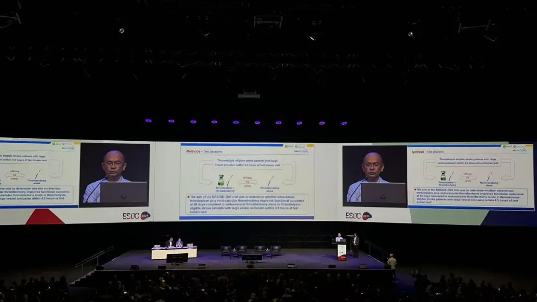 2025年5月21日,陆军军医大学第二附属医院神经内科杨清武教授和资文杰教授团队牵头、全国共39家卒中中心参与的《替奈普酶静脉溶栓联合取栓术对比单独取栓术治疗急性大血管闭塞性卒中的多中心随机对照试验(BRIDGE-TNK)》[4]登顶《新英格兰医学杂志》(NEJM),并同步于欧洲卒中组织会议(ESOC 2025)开幕式全体会议向全球发布!试验表明,对于4.5小时内大血管闭塞性卒中患者,静脉注射替奈普酶联合血管内取栓术相比单纯取栓术,可显著提高患者90天功能独立性(52.9% vs 44.1%,P=0.04),且安全性良好。