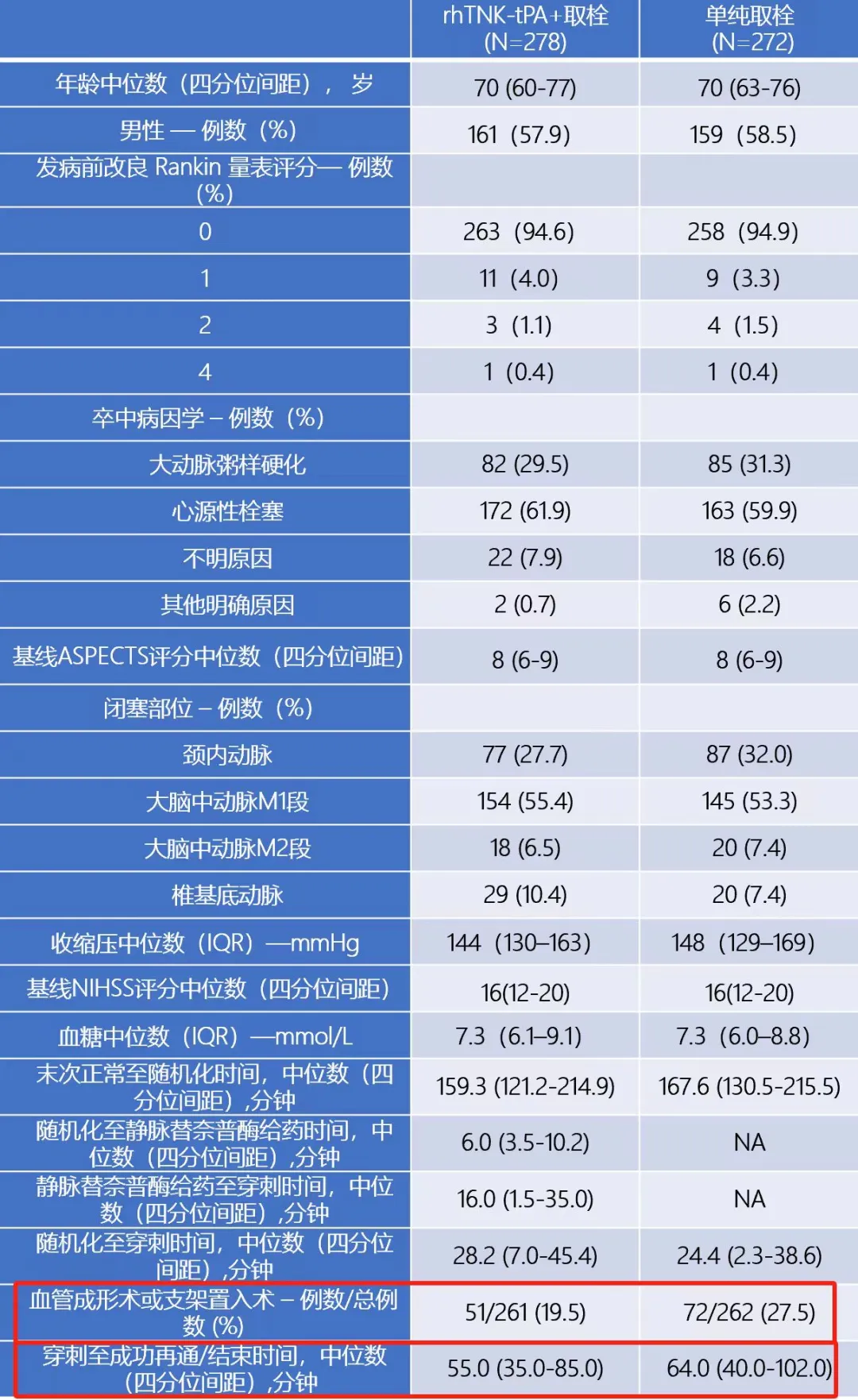 图3基线特征(基线特征平衡良好,血管成形术或支架置入术在rhTNK-tPA联合取栓组为19.5%,而在单纯取栓组为27.5%。rhTNK-tPA联合取栓组的中位穿刺到再灌注时间的绝对值缩短了9分钟)