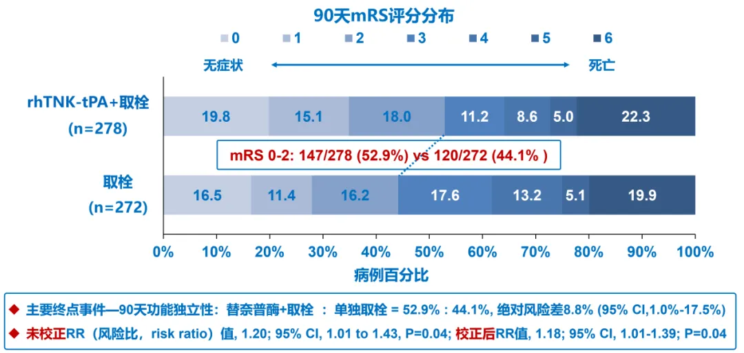 主要结局:rhTNK-tPA联合取栓组90天功能独立率达52.9%,显著高于单纯取栓组的44.1%(风险比1.18,95%置信区间1.01-1.39,P=0.04)。