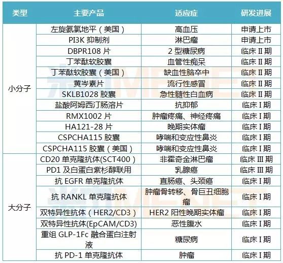 报告期内,石药集团多个研发产品获得临床许可,分别为新型口服抗凝药(SYHA136)、乳腺癌药(注射用紫杉醇阳离子脂质体)及肝内胆管癌及尿路上皮细胞癌药(SYHA1803)。此外,石药集团有2款小分子新药处于即将上市阶段,分别是左旋氨氯地平美国申请上市、PI3K抑制剂(商品名:Copiktra)国内申报上市。2018年9月,石药集团获得美国制药公司Verastem授权许可在中国开发及商业化Copiktra的独家特许权、市场推广权及产品批件。