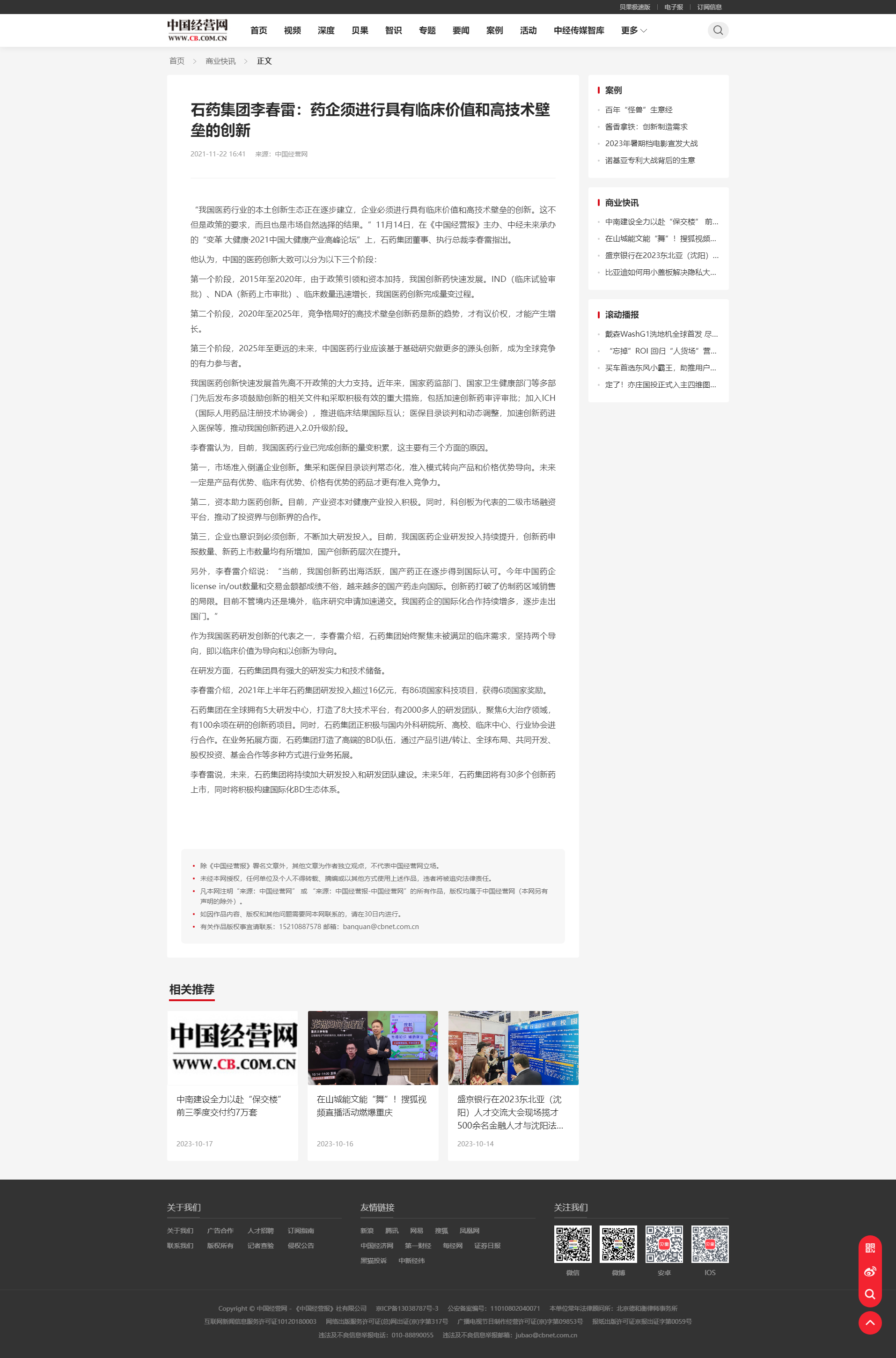 石药集团李春雷:药企须进行具有临床价值和高技术壁垒的创新