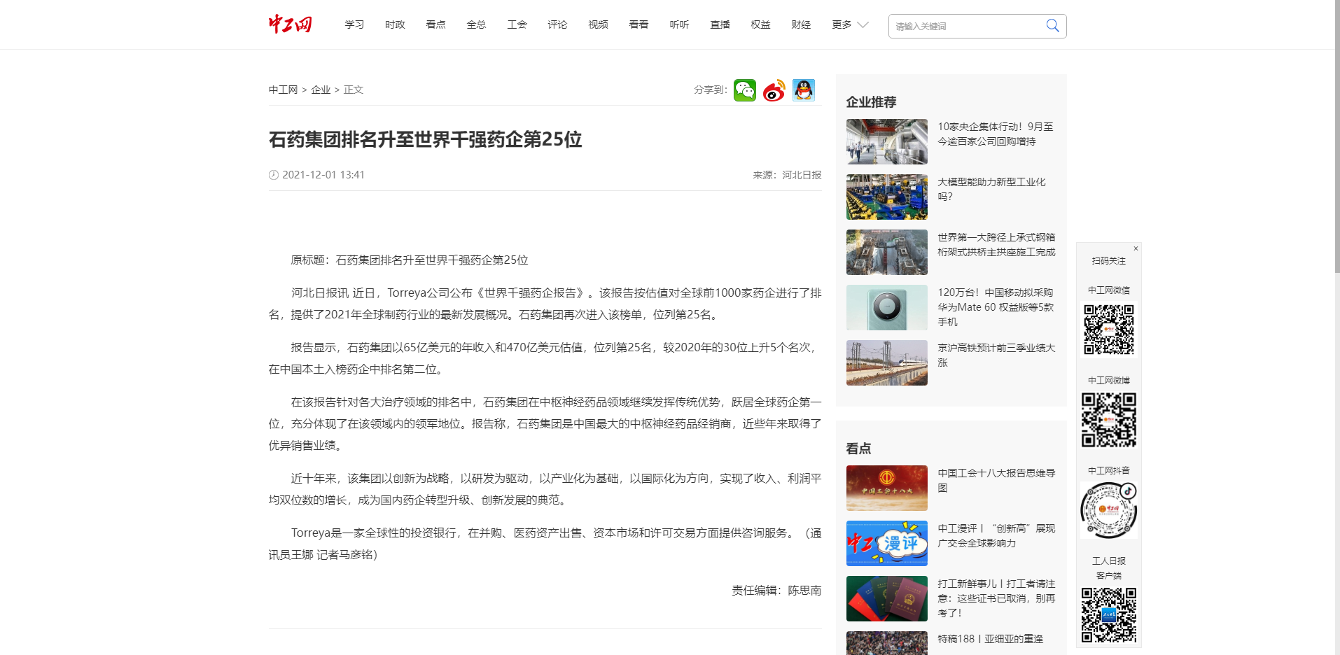 报告显示,石药集团以65亿美元的年收入和470亿美元估值,位列第25名,较2020年的30位上升5个名次,在中国本土入榜药企中排名第二位。