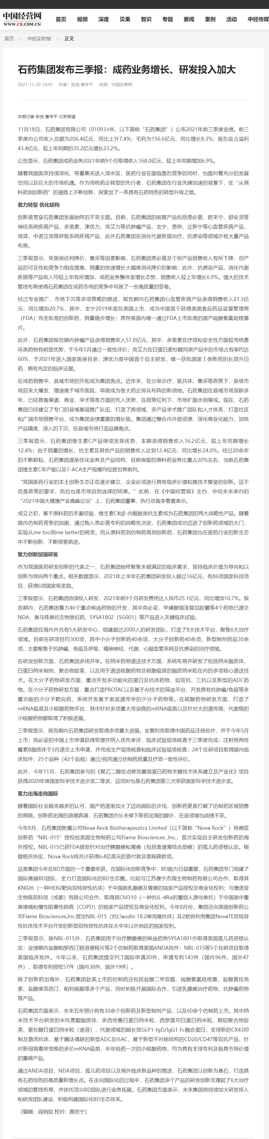 公告显示,石药集团成药业务2021年前9个月取得收入168.0亿元,较上年同期增加6.9%。