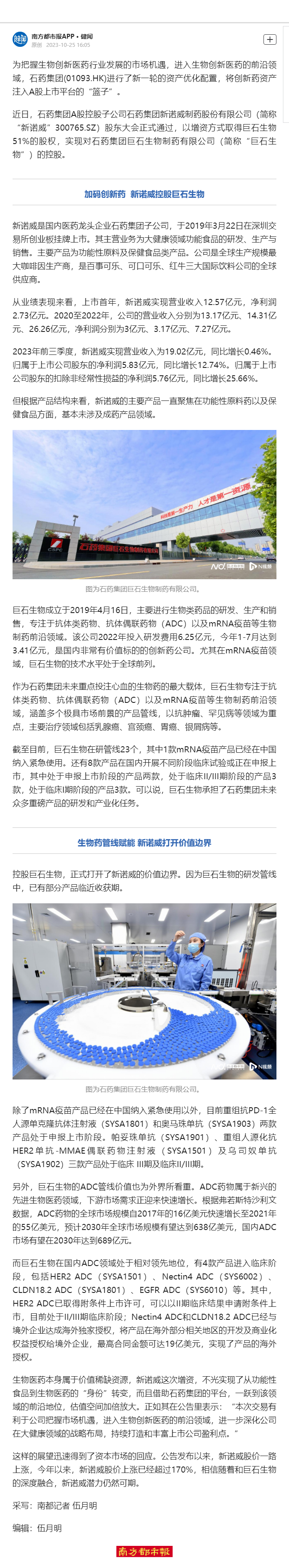 近日,石药集团A股控股子公司石药集团新诺威制药股份有限公司(简称“新诺威”300765.SZ)股东大会正式通过,以增资方式取得巨石生物51%的股权,实现对石药集团巨石生物制药有限公司(简称“巨石生物”)的控股。