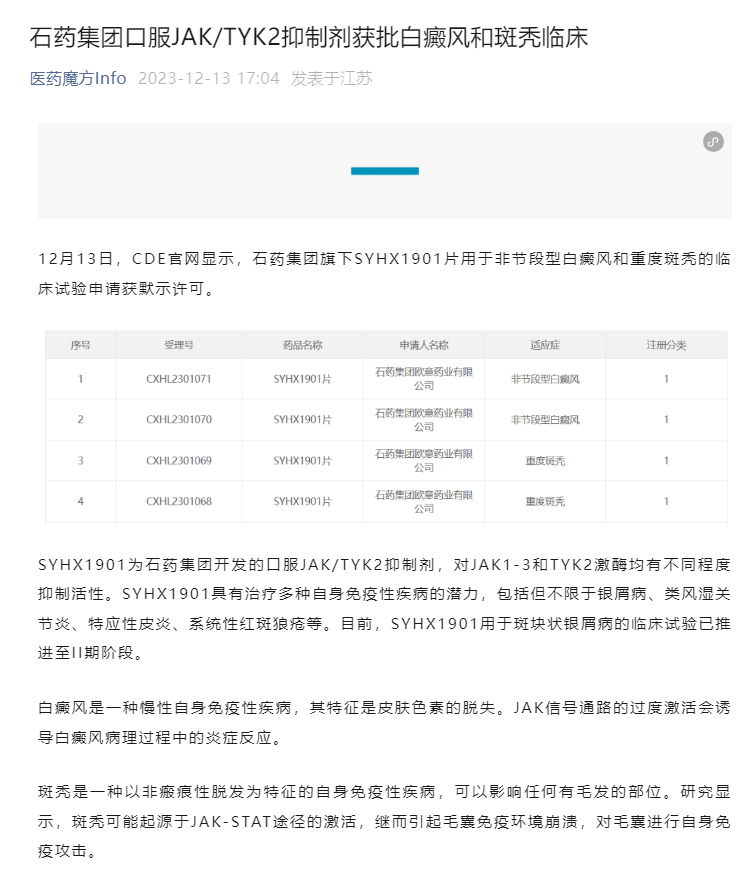 石药集团口服JAK/TYK2抑制剂获批白癜风和斑秃临床