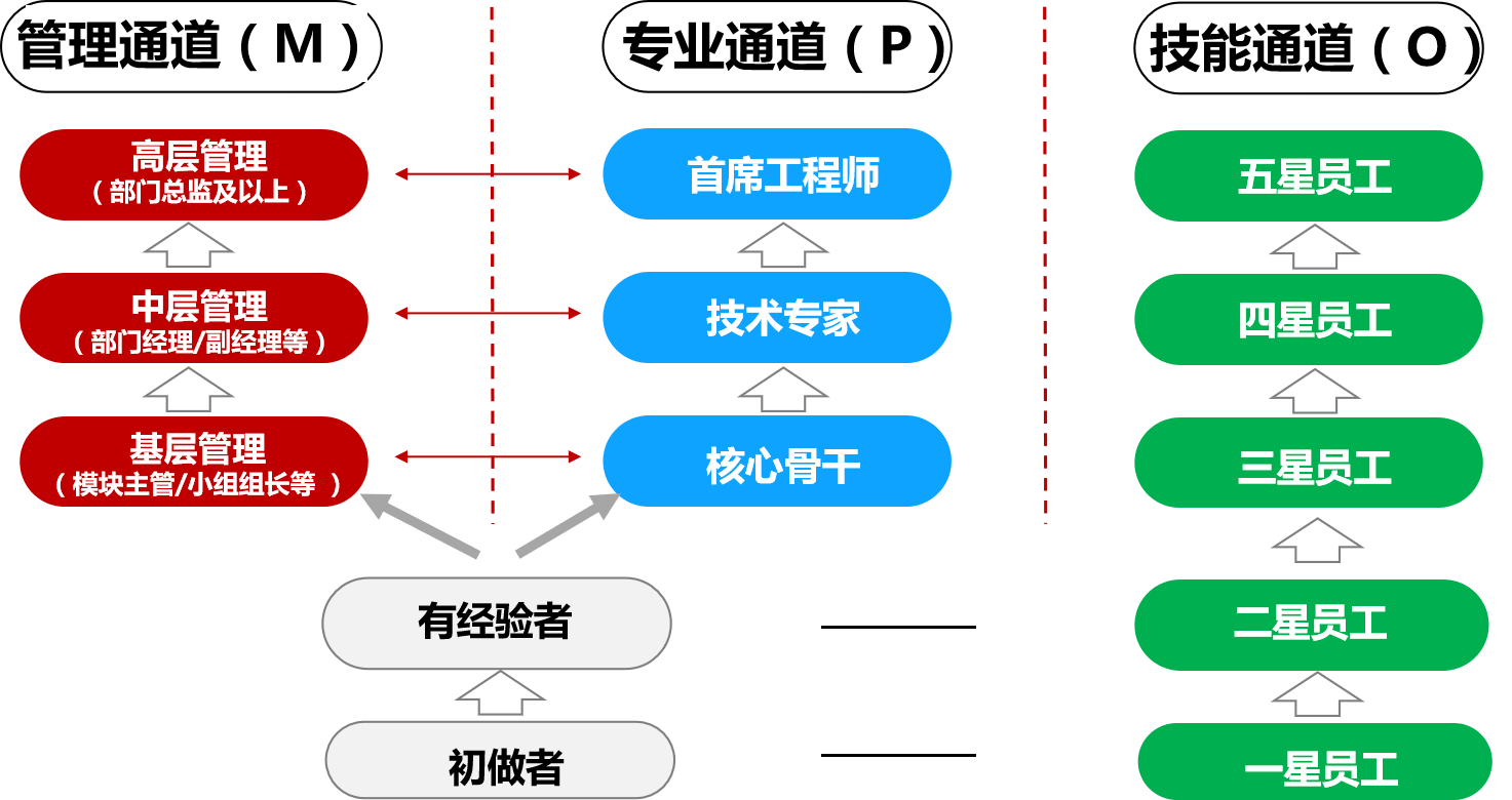 ① 管理通道(M)侧重管理能力提升,专业通道(P)侧重技术领域纵深发展,两者跨职能、跨领域发展。